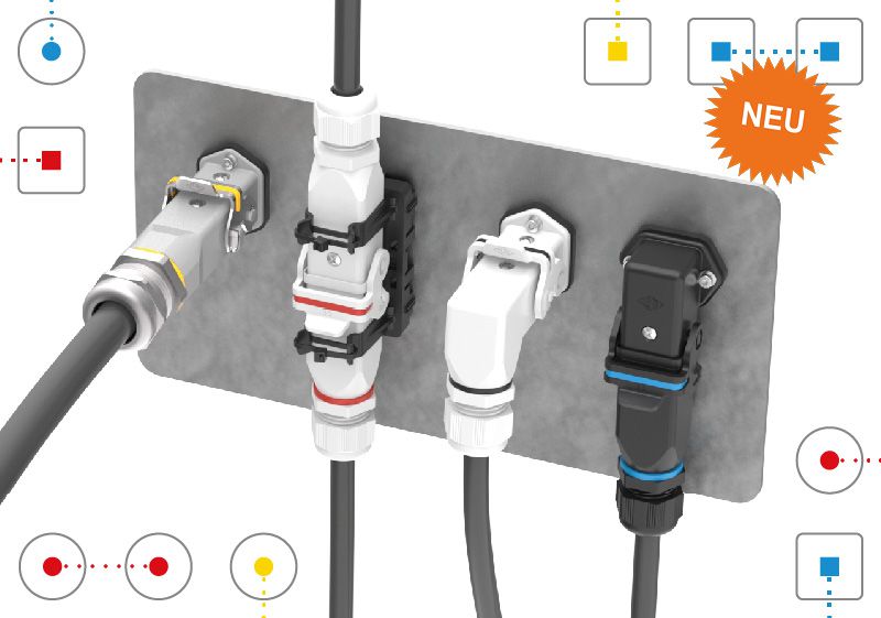 Industrielle Applikationen, wie Schaltanlagen, bieten häufig wenig Platz, um mehrere gleichartige Schnittstellen nebeneinander zu montieren. Kompakte und visuell differenzierbare Steckverbinder sind daher essenziell, um Fehlsteckungen zu vermeiden. Mit dem neuen starren Verschlussbügeldesign der Baugrösse „21.21“ mit einzigartiger Verschlusskontur, bietet ILME nicht nur eine vielseitige und zuverlässige Lösung, sondern auch eine direkt erkennbare optische Möglichkeit der Codierung von kompakten Steckverbindungen. Das neue Verschlussbügeldesign ersetzt alle bisherigen starren Standard-Verschlussbügel aus Metall und Kunststoff der Baugrösse „21.21“ und bietet im Vergleich zum bisherigen Verschlussbügel, eine bessere Handhabung durch ergonomisches Design und einen starken Halt durch einen verbesserten Schliessmechanismus. Dank einzigartiger Verschlussbügelkontur, können die Steckverbindungen optional durch ein farbliches Codierungssystem bestehend aus Ringen und Clipsen visuell unterschieden werden. Diese sind sowohl für Innen- als auch für Ausseninstallationen, einschliesslich Standard und EMV-Umgebungen geeignet.