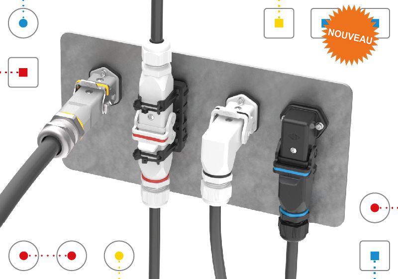Les applications industrielles, telles que les installations de commutation, offrent souvent peu d'espace pour monter plusieurs interfaces similaires les unes à côté des autres. Des connecteurs compacts et visuellement différenciables sont donc essentiels pour éviter les erreurs de connexion. Avec le nouveau design rigide du clip de verrouillage de la taille « 21.21 » et son contour de verrouillage unique, ILME offre non seulement une solution polyvalente et fiable, mais aussi une possibilité de codage visuel directement reconnaissable pour les connecteurs compacts. Le nouveau design de l'étrier de verrouillage remplace tous les étriers de verrouillage rigides standard en métal et en plastique de la taille « 21.21 » et offre, par rapport à l'étrier de verrouillage précédent, une meilleure maniabilité grâce à son design ergonomique et une forte tenue grâce à un mécanisme de fermeture amélioré. Grâce au contour unique de l'étrier de verrouillage, les connecteurs peuvent être différenciés visuellement à l'aide d'un système de codage couleur composé d'anneaux et de clips. Ceux-ci conviennent aussi bien aux installations intérieures qu'extérieures, y compris dans les environnements standard et CEM.